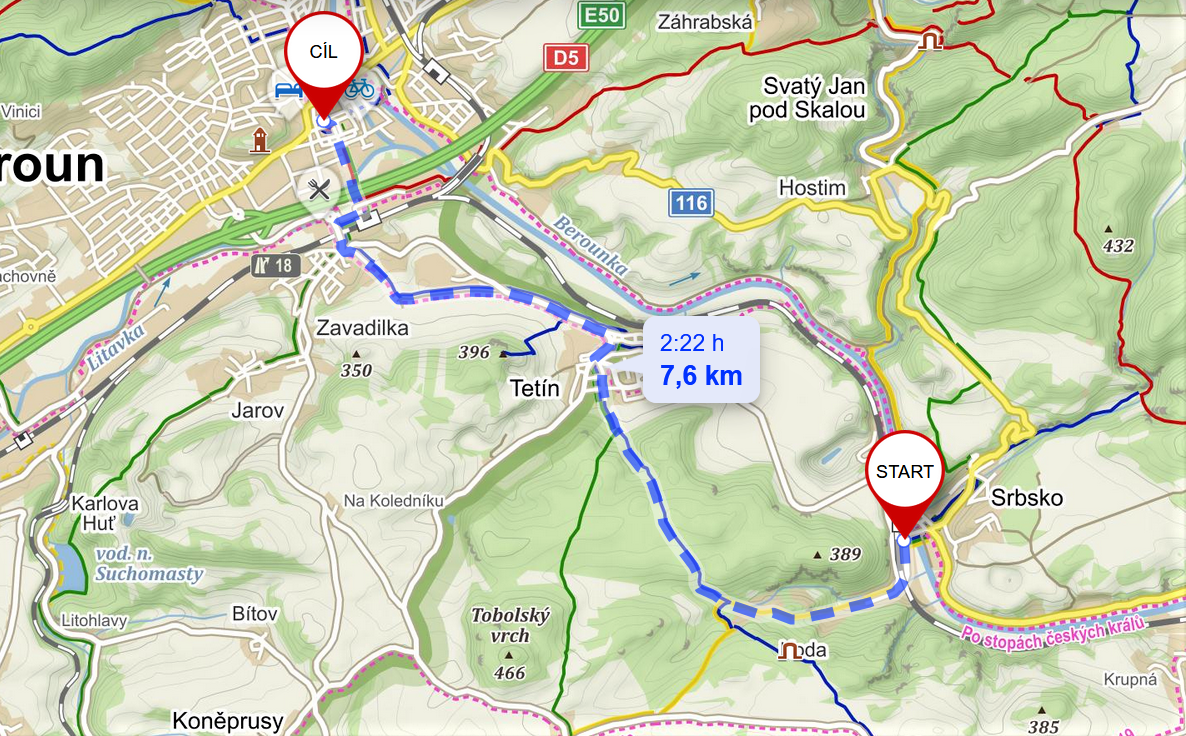 Stezka sv. Ludmily vede ze Srbska přes Tetín do Berouna. Na výlet se tedy dá z Radotína vyrazit bez auta. Z vlakové stanice Srbsko se vydáte po ulici Za vodou, přejdete koleje a začnete stoupat po ulici Na Kodě ke Kodským kaskádám. Zde se napojíte na modrou turistickou značku a půjdete po vrstevnici až do Tetína, kde se určitě nějaký čas zdržíte.
